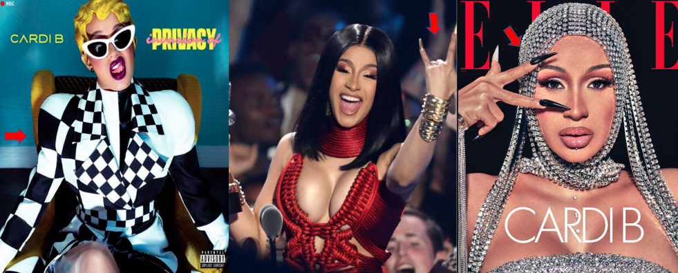 (On the left, Cardi wears the checkboard pattern that shows up in nearly every Masonic lodge across the earth. This symbolizes that existence is made up of good and evil intermingled (and essentially inseparable). Yahweh is a god, but Lucifer is the true lord in Masonic teaching. She also shows the devil horns in the middle picture, and then pays homage to the one-eyed God on the right.)